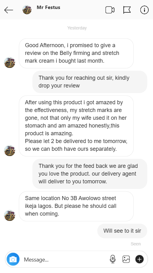 "As a man, I never cared much about creams, but I was wrong. This product works. My stretch marks from weightlifting are fading fast, and the warm sensation makes me feel like it’s really doing the job. Worth every naira."