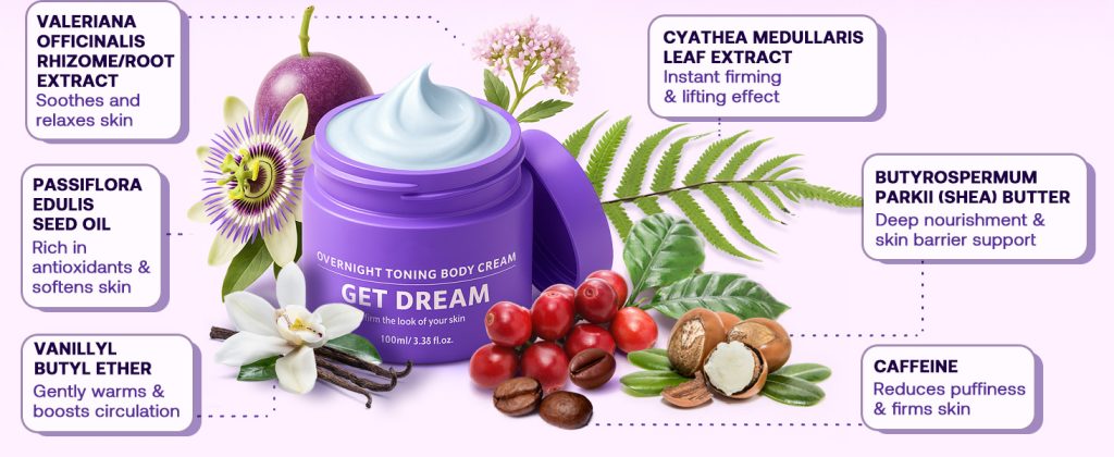 Valeriana officinalis rhizome/root extract Soothes and relaxes skin, helps soften rough texture Reduces irritation, supports comfort on stretched or dry skin